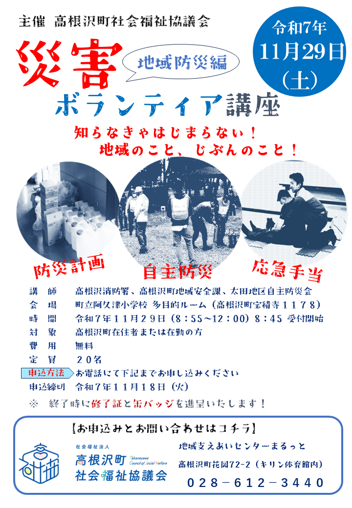 地域防災や災害ボランティアの基礎知識習得のため、消防機関、町行政担当課、自主防災組織の皆様を講師としてお招きし、地域防災の基本的理解を深めます。身近な地域防災の取組みについて、一緒に考えてみませんか?
