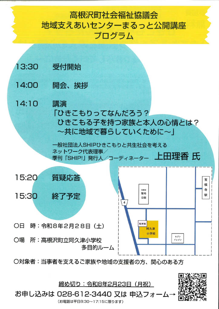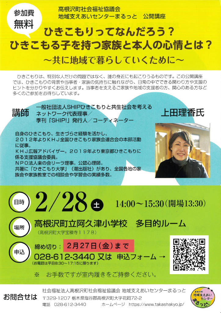 〇講師:一般社団法人SHIPひきこもりと共生社会を考えるネットワーク 共同代表 上田理香氏