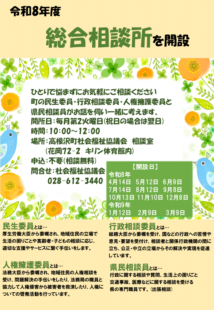 高根沢町社会福祉協議会では、令和8年度に総合相談所を以下のとおり開設します。